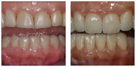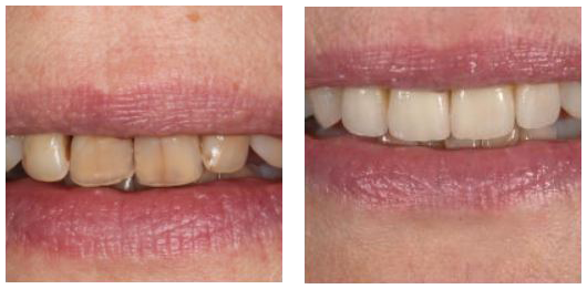 Etualueen värjäytyneet hampaat korvattu keraamisilla osakruunuilla.